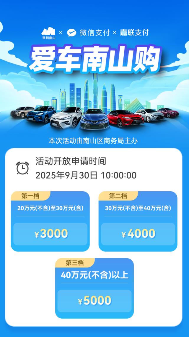 深圳国际车展即将启幕,南山区同步加码,9月30日起,由南山区商务局主办的“爱车南山购”之“Chill日好车节”火力全开,总计3000万元的购车补贴限时发放,申请完即止。