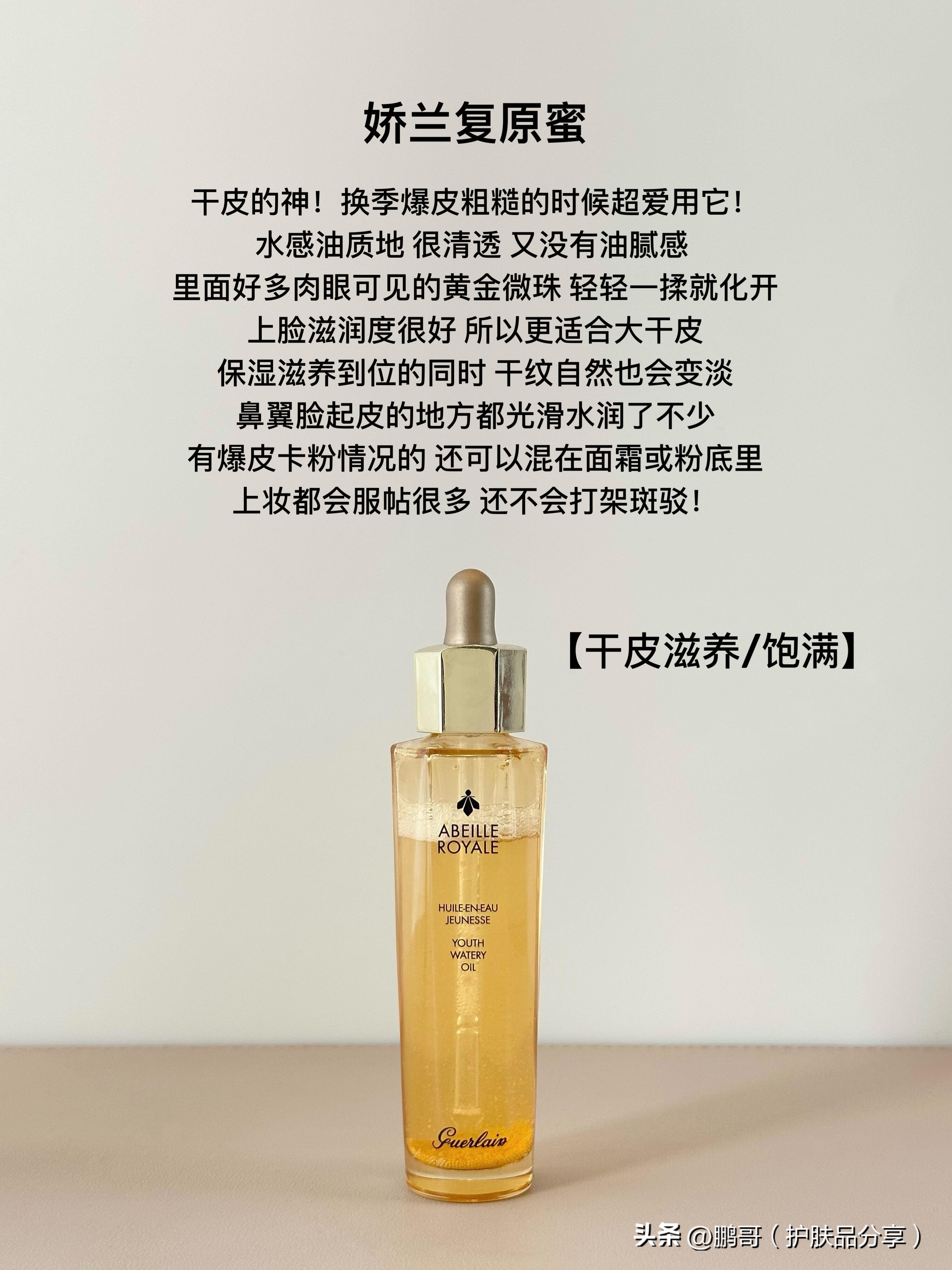 第六款:娇兰复原蜜精华上脸是有点油亮,按摩一下很快就吸收了,我脸干的时候就会用它维稳,用一段时间就舒服多了,干皮以油养肤必备的复原蜜,主要成分就是黑峰蜂蜜+蜂王浆。
