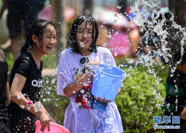 4月13日,人们在景谷傣族彝族自治县文体中心广场上泼水狂欢。 当日,云南省普洱市景谷傣族彝族自治县举行2019年采花泼水节,人们欢聚一堂,用相互泼水的方式互送祝福、传递快乐。 新华社记者 胡超 摄