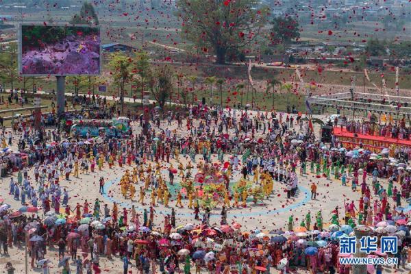 4月13日,在开幕式上,人们伴随直升机从空中洒下的花瓣跳舞 当日,云南省普洱市景谷傣族彝族自治县举行2019年采花泼水节,人们欢聚一堂,用相互泼水的方式互送祝福、传递快乐。 新华社记者 胡超 摄