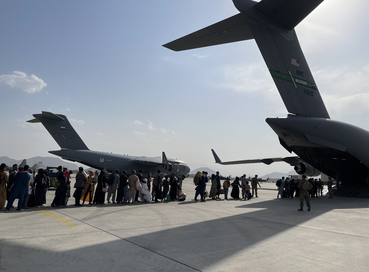2021年8月22日,人们在阿富汗首都喀布尔国际机场排队登上美国军用飞机离开。新华社发