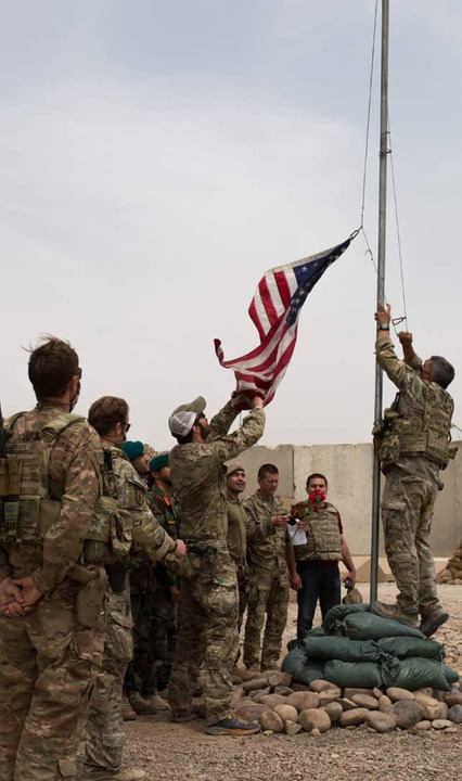 2021年5月2日,美军士兵在阿富汗赫尔曼德省一处军事基地降下美国国旗。新华社发(阿富汗国防部供图)