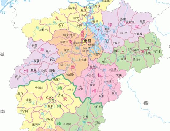 比如这幅老的江西地区,大家看看上面的九江,出现了三次,这里面红字九江表示的是“九江地区”,红色圆圈那个九江指的是九江市,而旁边的九江指的则是九江县