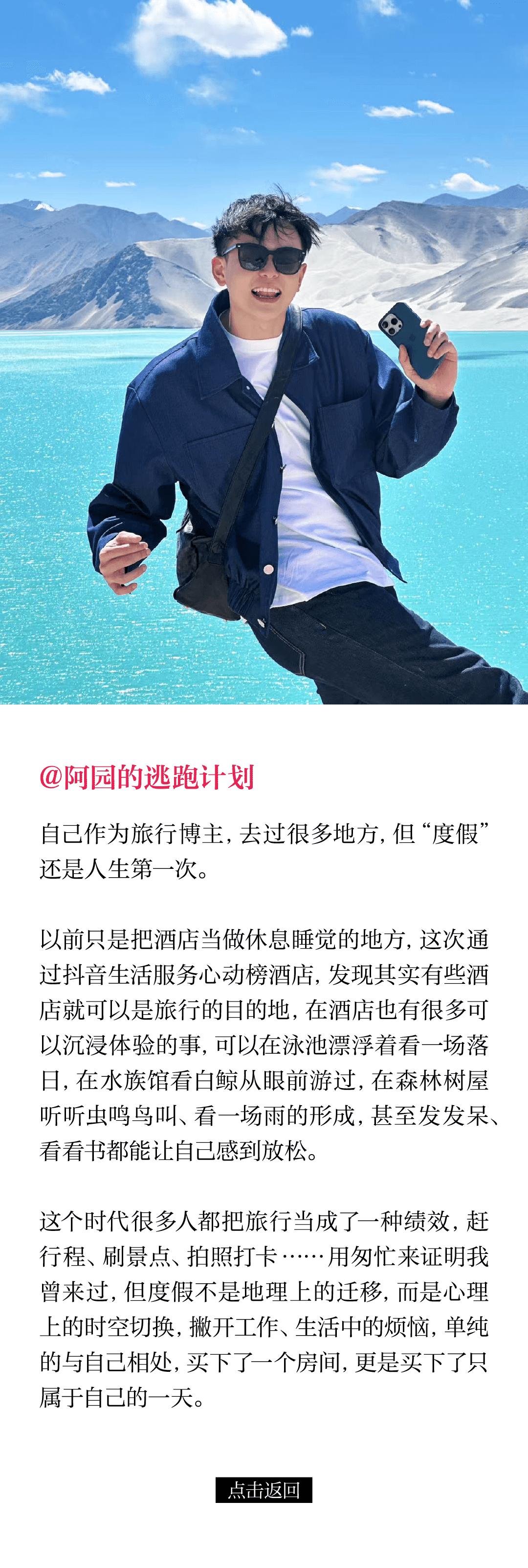 以前只是把酒店当做休息睡觉的地方,这次通过抖音生活服务心动榜酒店,发现其实有些酒店就可以是旅行的目的地,在酒店也有很多可以沉浸体验的事,可以在泳池漂浮着看一场落日,在水族馆看白鲸从眼前游过,在森林树屋听听虫鸣鸟叫、看一场雨的形成,甚至发发呆、看看书都能让自己感到放松。