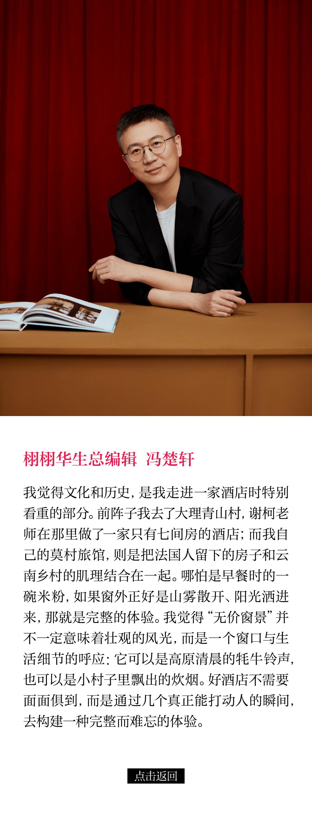 我觉得文化和历史,是我走进一家酒店时特别看重的部分。前阵子我去了大理青山村,谢柯老师在那里做了一家只有七间房的酒店;而我自己的莫村旅馆,则是把法国人留下的房子和云南乡村的肌理结合在一起。哪怕是早餐时的一碗米粉,如果窗外正好是山雾散开、阳光洒进来,那就是完整的体验。我觉得“无价窗景”并不一定意味着壮观的风光,而是一个窗口与生活细节的呼应:它可以是高原清晨的牦牛铃声,也可以是小村子里飘出的炊烟。好酒店不需要面面俱到,而是通过几个真正能打动人的瞬间,去构建一种完整而难忘的体验。