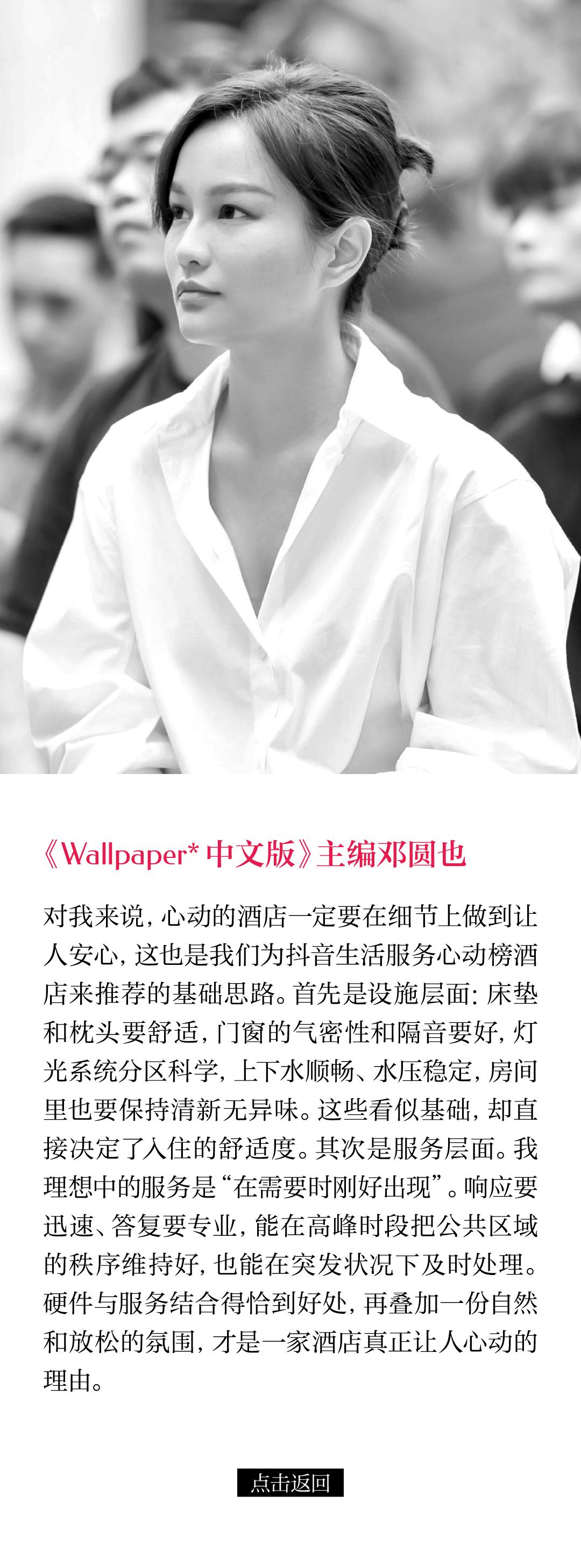 对我来说,心动的酒店一定要在细节上做到让人安心,这也是我们为抖音生活服务心动榜酒店来推荐的基础思路。首先是设施层面:床垫和枕头要舒适,门窗的气密性和隔音要好,灯光系统分区科学,上下水顺畅、水压稳定,房间里也要保持清新无异味。这些看似基础,却直接决定了入住的舒适度。其次是服务层面。我理想中的服务是“在需要时刚好出现”。响应要迅速、答复要专业,能在高峰时段把公共区域的秩序维持好,也能在突发状况下及时处理。硬件与服务结合得恰到好处,再叠加一份自然和放松的氛围,才是一家酒店真正让人心动的理由。