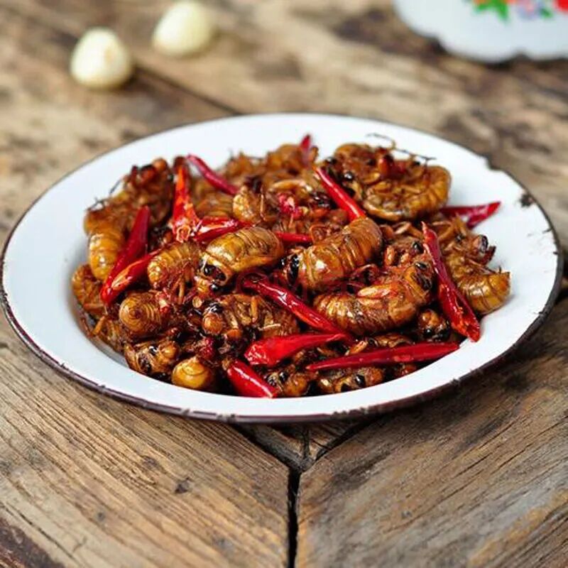 爬蚱,是河南的方言,也就是咱们经常说的蝉,蝉蜕皮之后,会飞的,有的地方叫爬猴、知了猴、老机牛子。每到夏夜,孩子们都会在树林里挑灯夜战,寻找这种繁殖奇特的小生物。 油炸爬蚱是以蚱蝉若虫(俗称爬拉猴、知了猴等)为主料制作的特色菜品,属高蛋白、低脂肪野味。其原料选用刚出土的蝉若虫,虫体蛋白质含量达58.58%,脂肪含量10.32%,并富含钾、磷、钙、锌等矿物质。据《中国药材学》记载,蝉若虫具有益精壮阳、止渴生津等功效,蝉蜕可辅助治疗咳嗽、风疹瘙痒等症。 制作时需将活蝉若虫经沸水烫洗后,以盐水浸泡或烹煮入味,再用小火油炸至酥脆,佐以精盐、孜然等调味。常见做法包括基础盐油版、香辣版、五香版等,部分菜谱搭配辣椒面、椒盐或黄瓜摆盘。预处理强调浸泡去污与焯水去腥,油炸需控制火候以防焦糊,成品口感外酥里嫩。该菜品现为部分高端酒店及民间特色饮食中的保健食品。