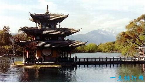 沿着丽江古城的方街往北走,就是象山脚下的玉泉公园,也叫黑龙潭,俗称“龙王庙”。从象山脚下的古栗树下涌出的泉水,汇成了近四万平方米的水塘,泉水清澈见底,水面上开着海菜花,水中的鱼儿点起阵阵涟漪,岸上花草树木,舞榭亭台,犹如一幅画卷。