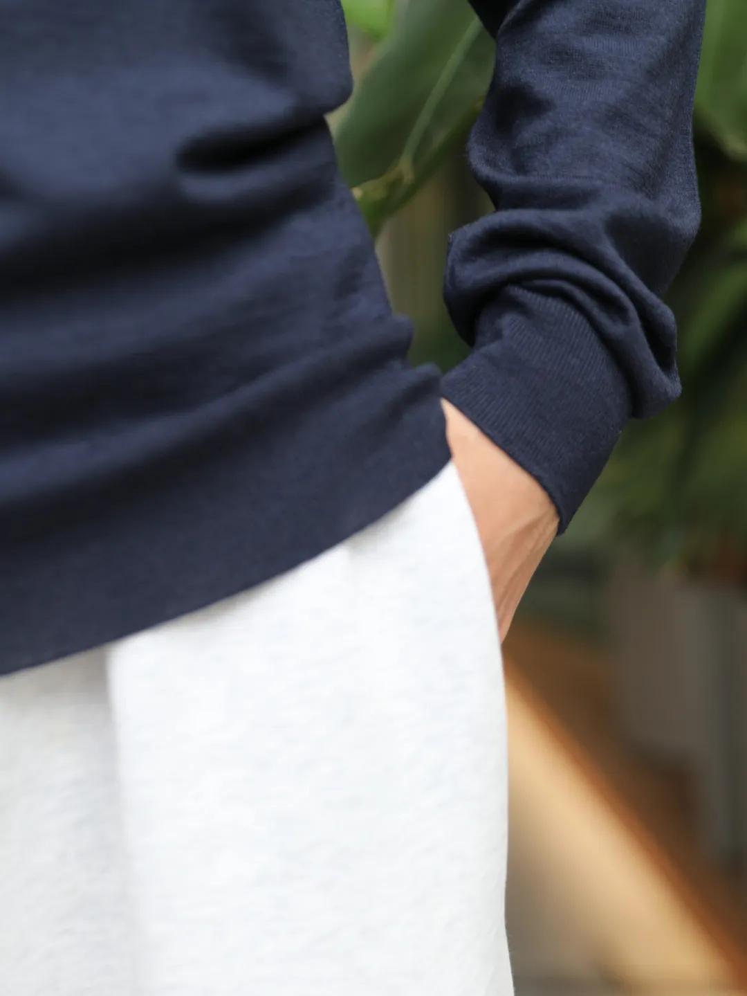 这款圆领衫范主推荐“午夜蓝”,John Smedley的深色从来不会死板,反而沉稳而明亮。在阳光下,会泛起精致深邃的光泽感,比纯黑更显质感,也更能衬托肤色,是追求低调高级感男士的最佳选择。