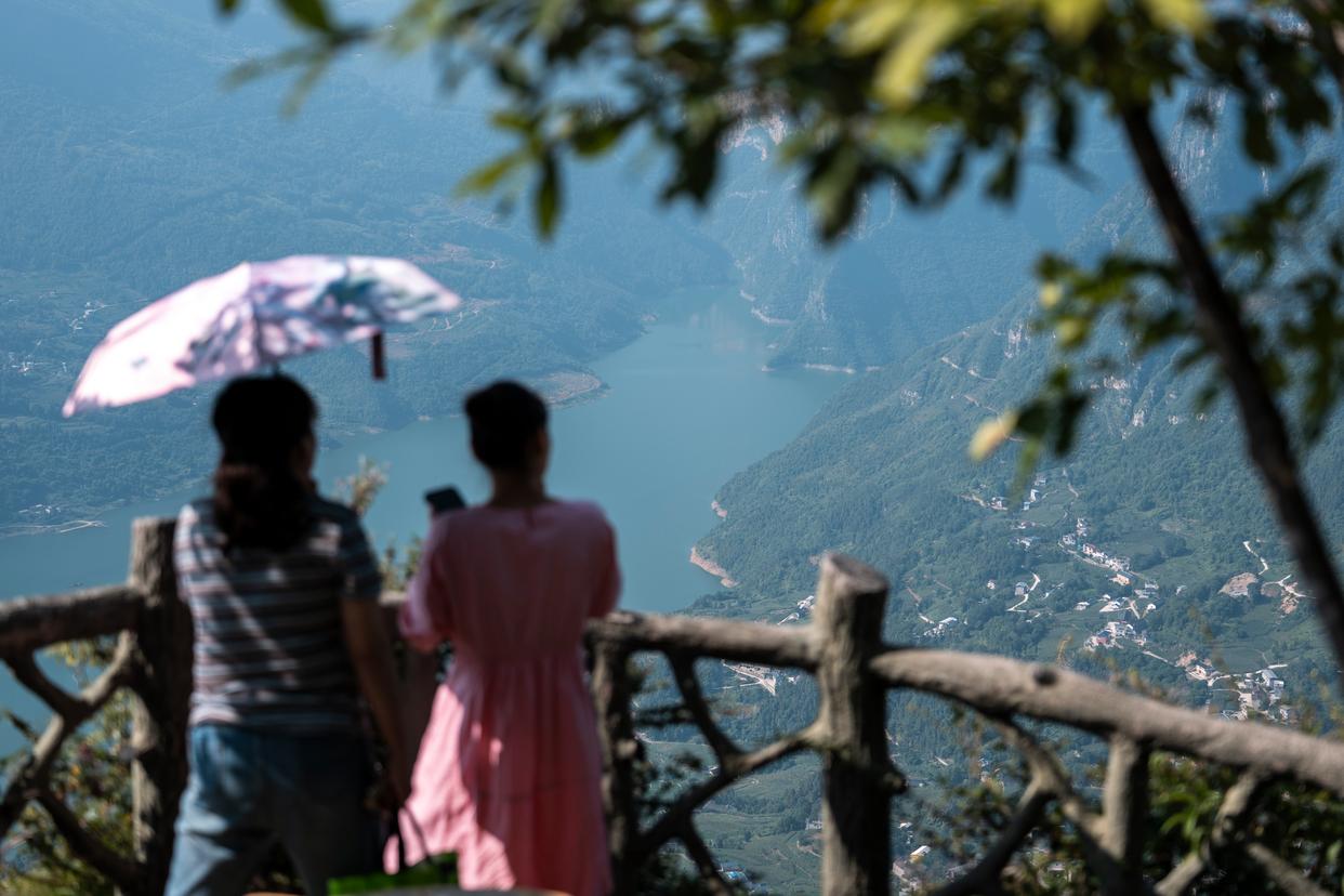 7月7日,在恩施州巴东县三里城哨棚顶景区,游客在步道观光。新华社记者 伍志尊 摄
