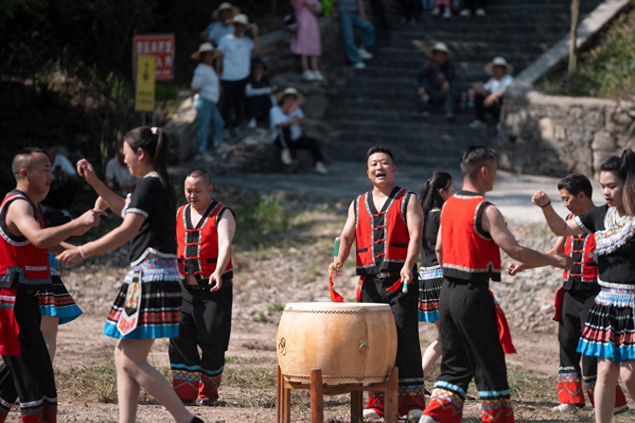 7月7日,在恩施州巴东县三里城哨棚顶景区,当地的土家族村民为游客表演“撒叶儿嗬”舞蹈。新华社记者 伍志尊 摄