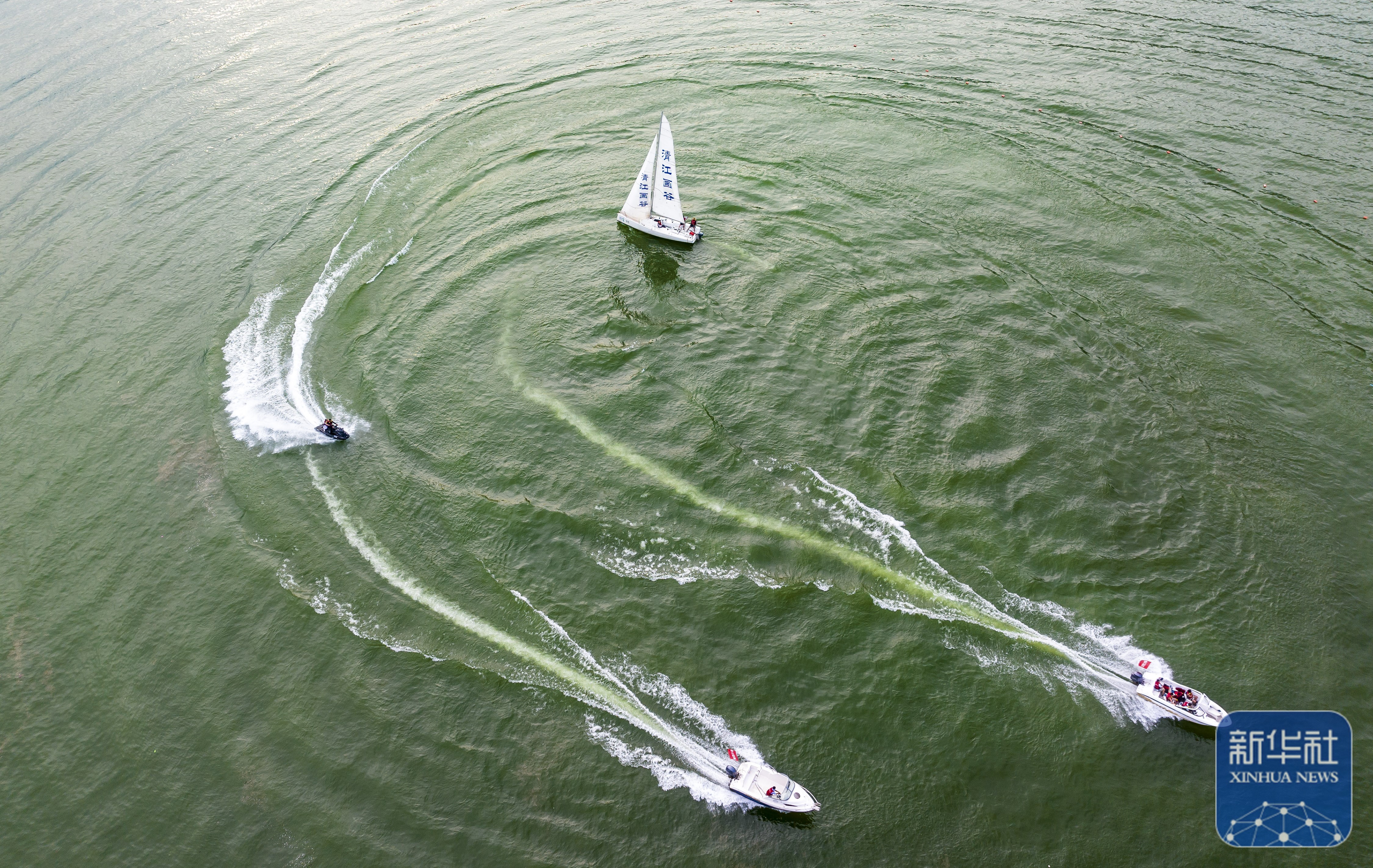 ↑ 7月7日,在恩施州建始县,游客在清江水语小镇水上运动中心体验水上游玩项目(无人机照片)。新华社发(赵军摄)