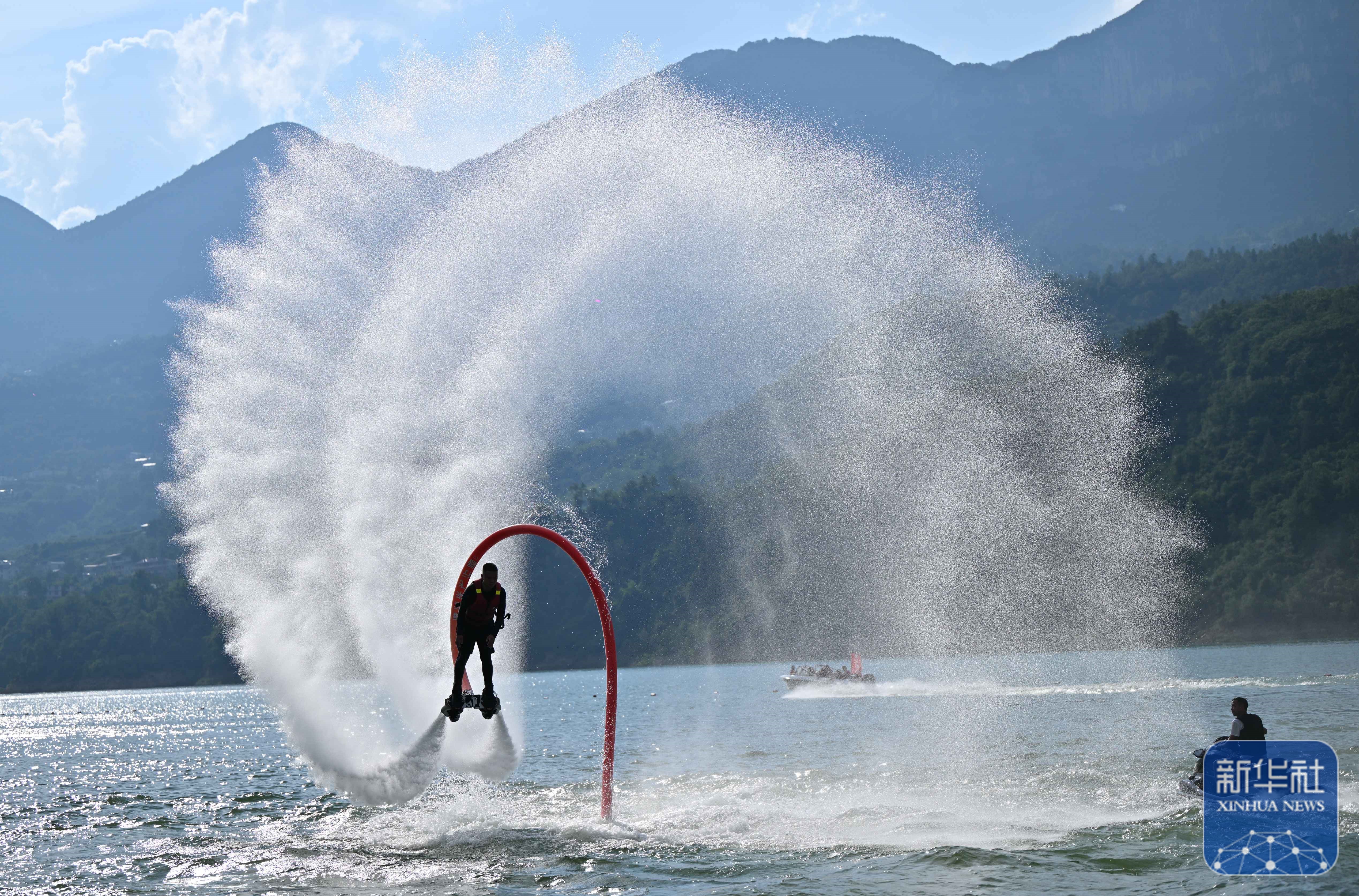 ↑ 7月7日,在恩施州建始县,水上运动中心的工作人员在进行“水上飞人”表演。新华社发(宋文摄)