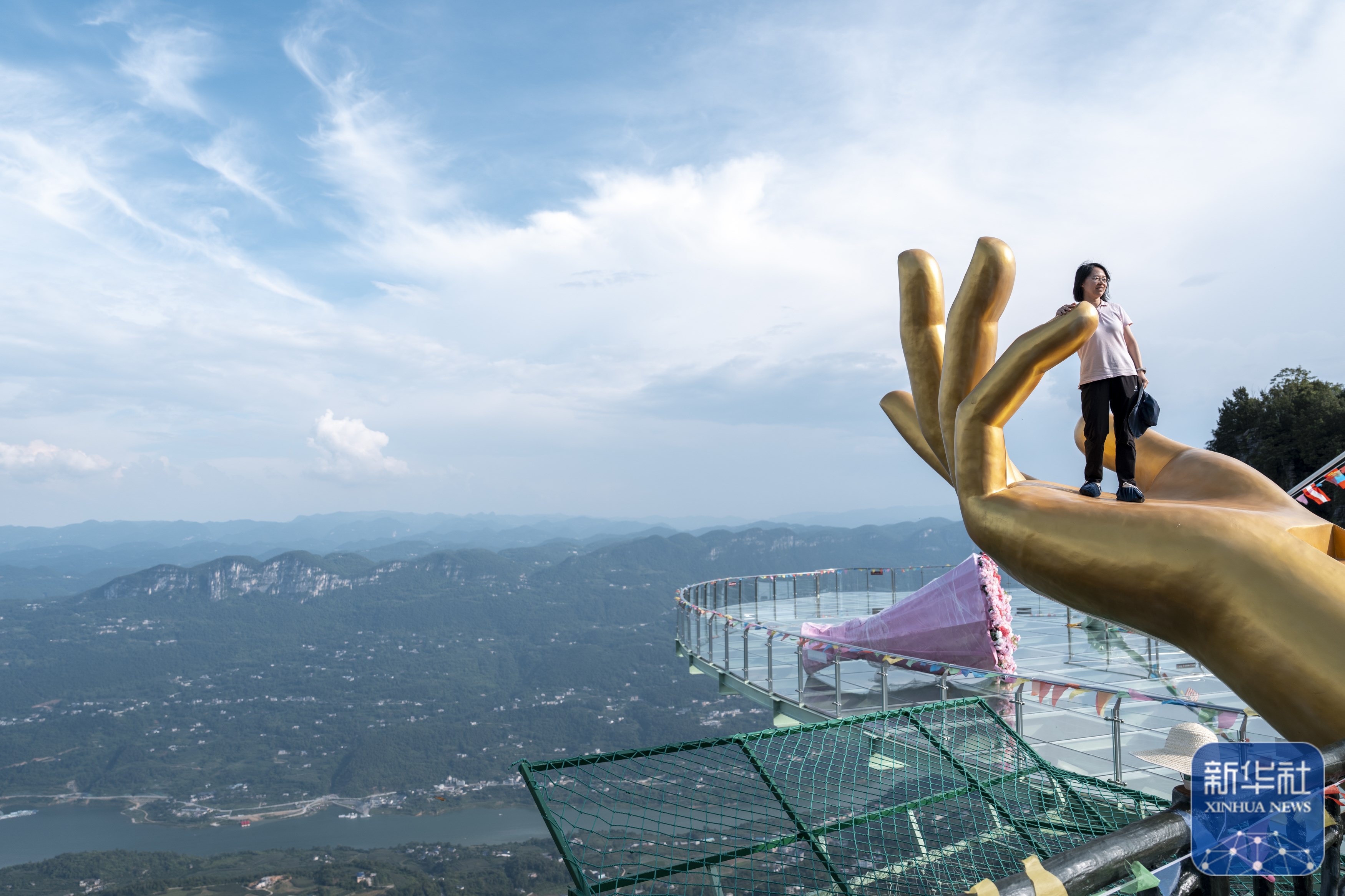 ↑ 7月7日,在恩施州巴东县水布垭镇香浓寨旅游驿站,游客在玻璃栈道上游玩。新华社发(宋文摄)