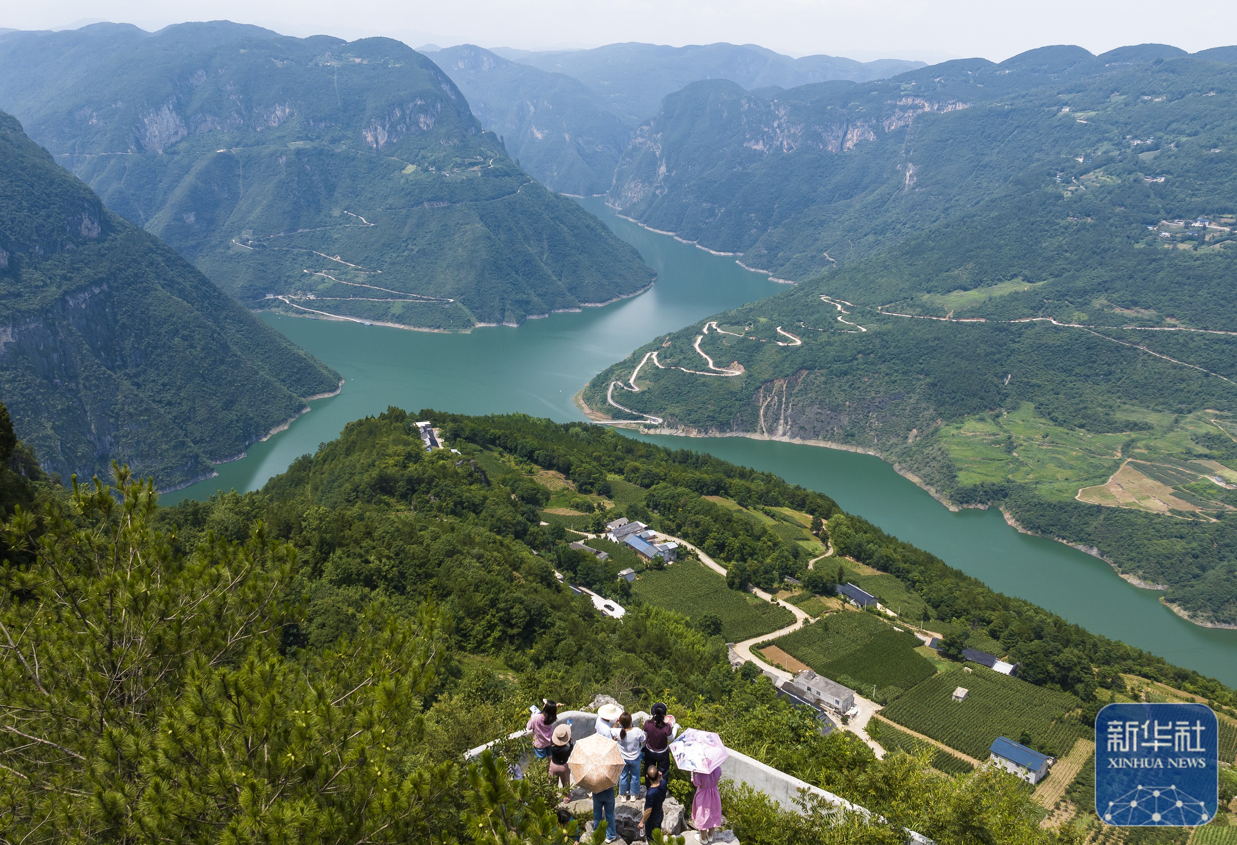 ↑ 7月7日,在恩施州巴东县水布垭镇,游客欣赏十字江风光(无人机照片)。新华社发(郑家裕摄)