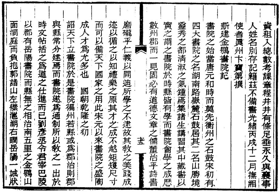 书院之始,当唐元和时,而莫先衡州之石鼓。宋初有四大书院之名,湖南路岳麓、石鼓居其二。名山胜境,灵秀之都,清淑之气钟焉。集诸生讲习其中,藏书以实之,谓之书院。于时县皆有学,而书院会学之成,历数州郡而一见,固必有道德文章之儒,董治乎诗书,磨礲乎仁义,以开迪所学之不逮。故其教之美,践成迹以循之,以知礼乐之原;其才之成,不越矩矱尺寸,而可以备天下国家之用。此宋、元以来书院之盛,陶成人才为尤多也。国朝乾隆之初,诏天下立书院,于是书院遍州若县,或为郡治,则郡与县常分建焉,而书院遂为通制。然其教之一出,为诗文帖括之为道之仕进而已。