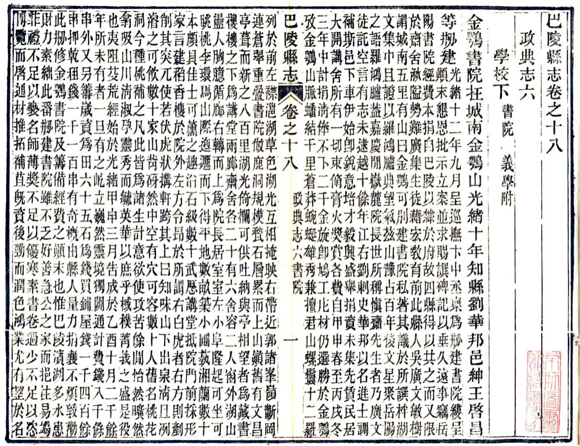 清光绪《巴陵县志》“卷之十八·政典志六”载“金鹗书院”:在城南金鹗山,光绪十年知县刘华邦,邑绅王启昌等创建。