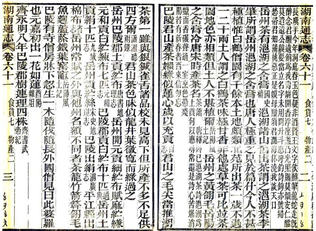 清光绪《湖南省志》“卷六十一·食货志七·物产二·岳州府”载:巴陵君山产茶懒绿,似莲心,岁以充贡(《省志》)。君山之毛尖,当推湖茶第一。虽与银针、雀舌诸品校,未见高下,但所产不多,不足供四方尔(《潇湘听雨录》)。君山茶色、味似龙井,叶微宽而绿过之。
