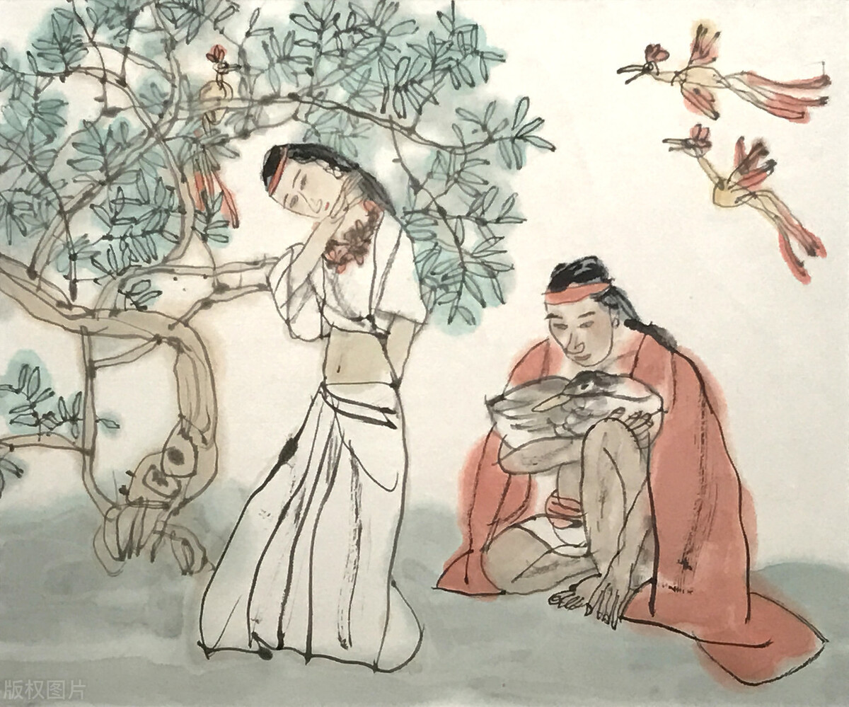 伏羲也叫宓牺或庖牺,是上古神话中的天神之一。传说他教会人类画八卦图记录事件,教会人类编织渔网捕鱼,更重要的是他将火种带进了人类的生活中,让人类摆脱了茹毛饮血的饮食习惯。在中国西南地区的苗瑶等少数民族中流传着女娲和伏羲的故事,他们不仅是夫妻,还是兄妹,也是人类的始祖。相传,伏羲和女娲本是一对兄妹。那时他们只有十来岁,一天,电闪雷鸣,风雨骤下,雷公发威想要降灾人间。他们的父亲站在屋顶上,用叉子叉住雷公的腰部,并将他关进了提前做好的铁笼里。第二天,父亲去街上买香料准备把雷公腌制成菜,并嘱咐伏羲和女娲千万不要给雷公喝水。父亲出门后,雷公假装饥渴乞求兄妹给点水喝,善良的女娲禁不住雷公的乞求就给雷公喝了几滴水。结果雷公喝完水后挣破了铁笼,重获自由。他为了感谢兄妹俩的滴水之恩,送给他们一颗牙齿,让他们种进土里,并对兄妹俩说:“如果遭了灾难,可以藏在所结的果实当中。”说完就飞走了。从集市回来的父亲看到雷公跑了,知道人间将要大难来临,于是连夜打了一个铁船。伏羲和女娲将牙齿种进了土里,第二天就结了一个很大的葫芦,正好能装下兄妹两个人。不出所料,第三天,天气突然骤变,刮起了黑风,大雨倾盆而下。父亲爬到做好的铁船上,伏羲和女娲躲进了葫芦里。很快,洪水淹没了田园,淹没了山丘。水面越来越高,一直高到了九重天的天门。父亲站在船头用力锤击天门,大喊:“快开门,让我进来”门里的天神急忙让水神赶快退水。瞬间雨停风止,洪水退去,船和葫芦从天空中跌到了地上。因为铁船坚硬,父亲被摔得粉碎致死,而由于葫芦有弹性,所以伏羲和女娲活了下来。兄妹两成了世间仅有的两个人类,而其他的人类都在洪水中死去了。此后,哥哥伏羲和妹妹女娲无忧无虑地幸福地生活在地球上,为了让人类能不断繁衍,兄妹俩结为夫妻,成为了再造人类的始祖。