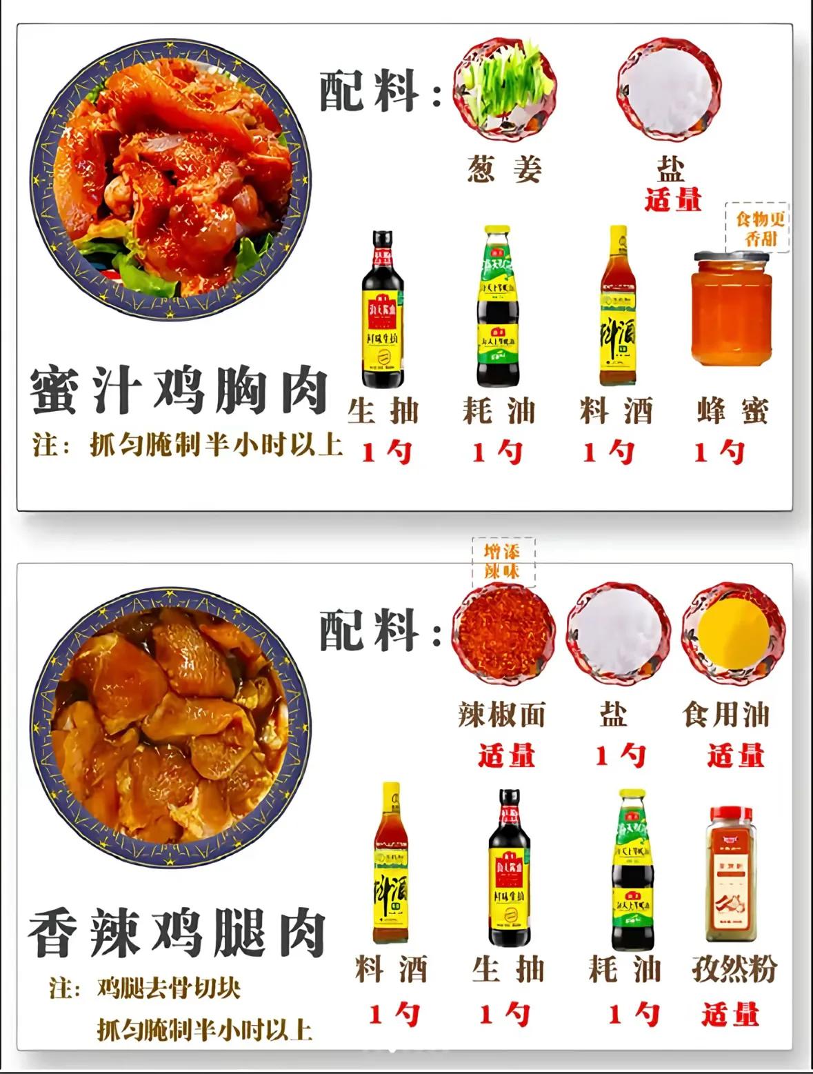 • 配方:葱姜适量、盐少许、生抽1勺、蚝油1勺、料酒1勺、蜂蜜1勺