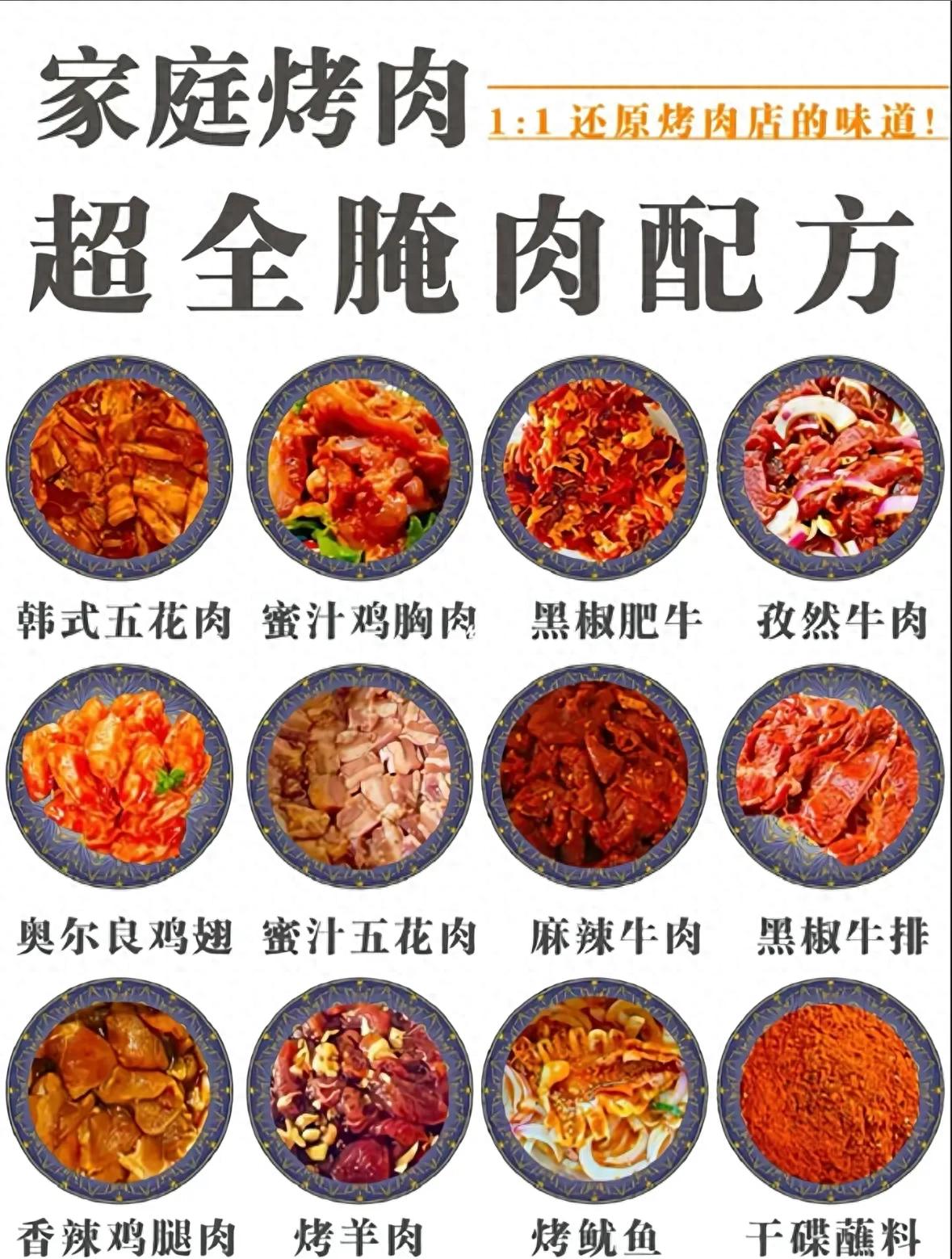 谁能拒绝滋滋冒油、香气扑鼻的家庭烤肉呢?但很多人在家腌肉不是“没味”就是“柴得咬不动”。今天,我把压箱底的家庭烤肉超全腌肉配方分享给你,从韩式五花肉到麻辣牛肉,12款口味一网打尽,让你在家就能1:1复刻烤肉店的神仙味道,从此实现“烤肉自由”!