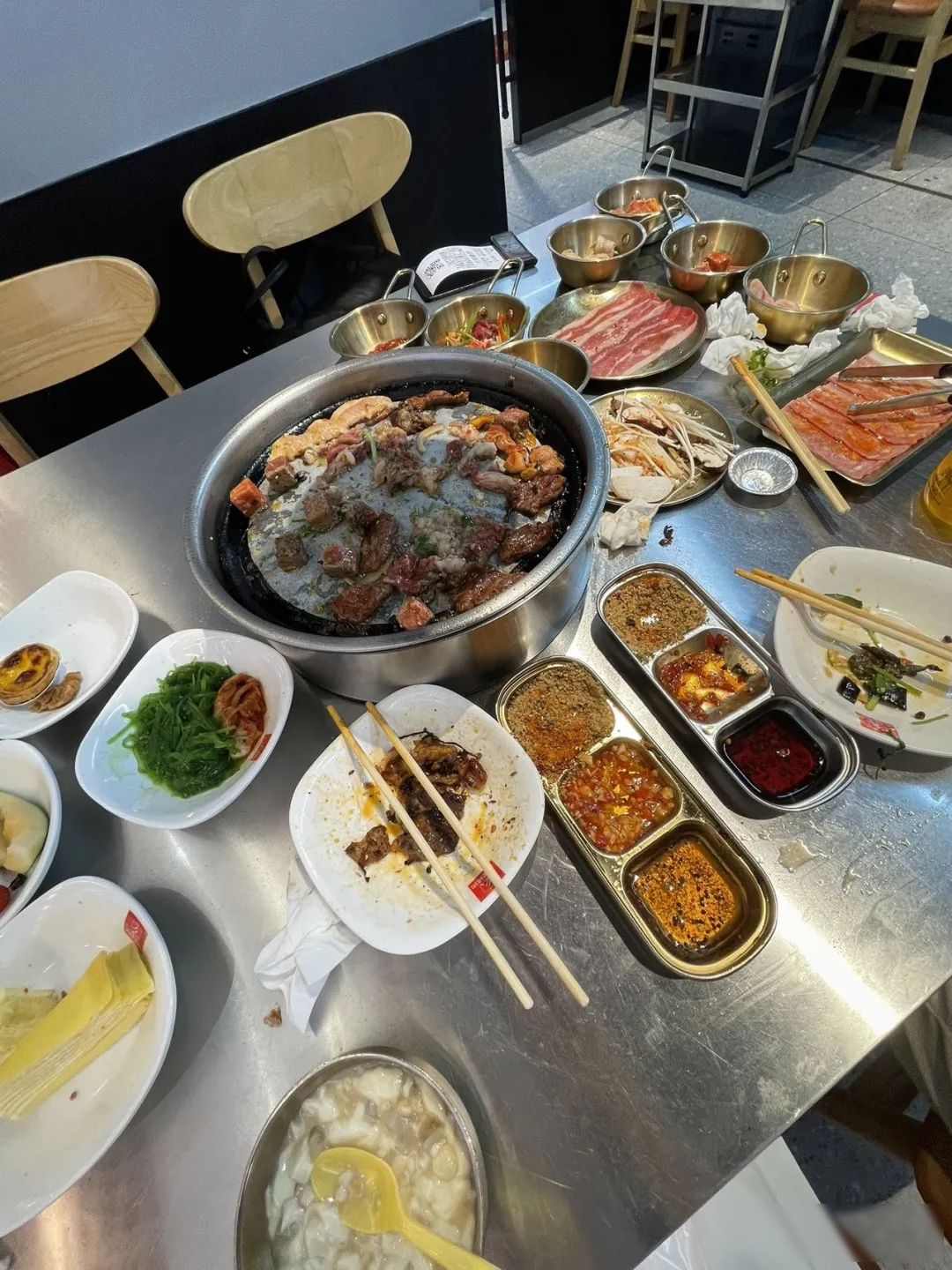 1. "味蕾的盛宴:" 每天都能接触到琳琅满目的食材,从各种肉类(牛排、羊排、五花肉、烤肉串等)、海鲜(虾、贝类、鱼片)到蔬菜(各种菌菇、青椒、洋葱、玉米等),还可以品尝到丰富的蘸料和酱料。每天都有新的味觉体验。