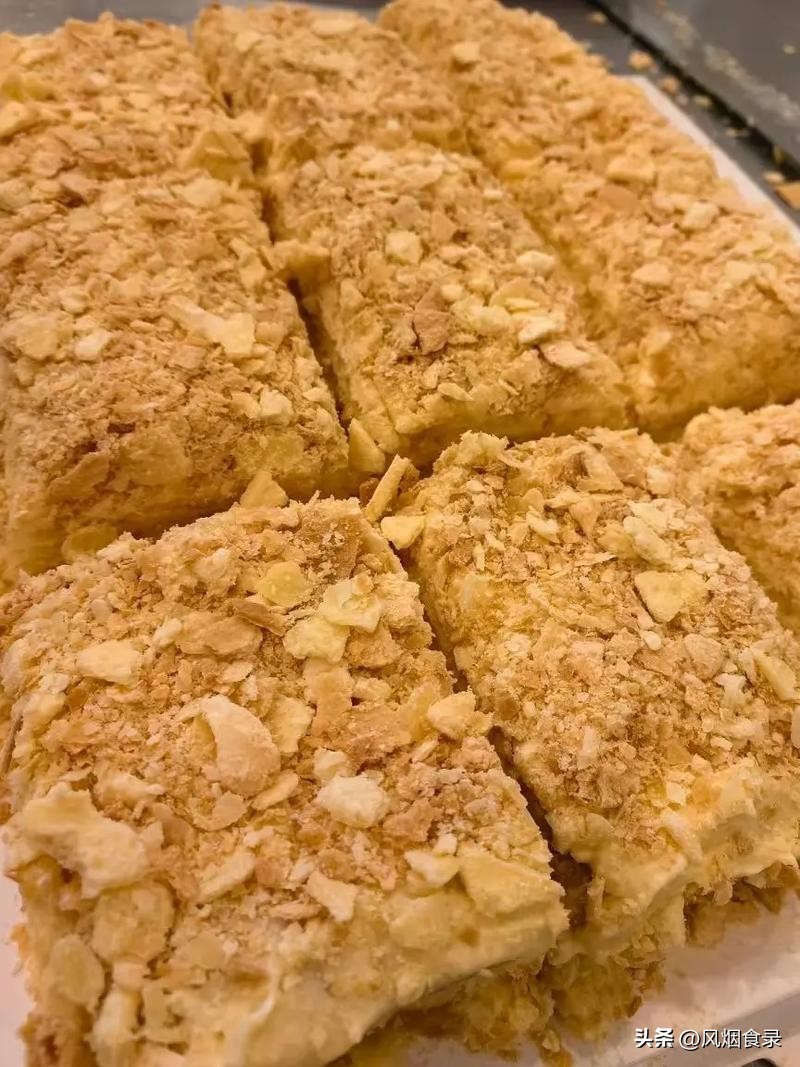 面坯得冻过再烤,蛋奶糊要慢火熬到挂勺,叠罗汉似的压七层,冻四小时才切块。