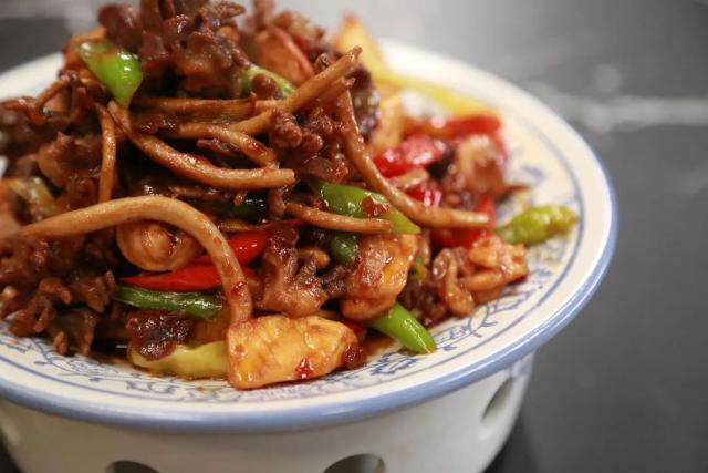 鸭胗、鸡腿肉、冬笋和茶树菇分别改刀过油(鸭胗和鸡腿肉需腌制后过油);锅内留底油炒香郫县豆瓣酱、黄豆酱和各种小料,放入四宝翻炒,用酱油和盐等稍微调味,一道南北人都爱吃的干锅菜就做好啦~