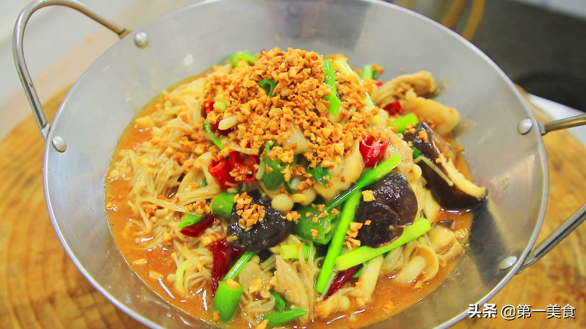喜欢吃辣的朋友可以再淋入一点辣椒油3克。翻炒几下以后,就可以起锅把炒好的菌菇装在小干锅中,放上剩下的金蒜,然后点上火就可以食用了。