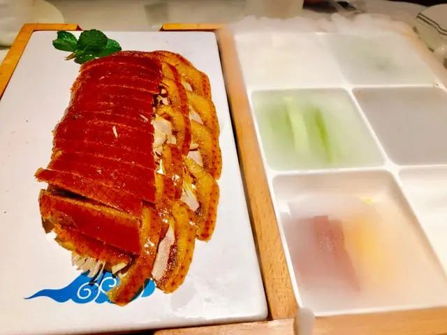 北京烤鸭通常被片皮上桌,非常精致漂亮,毕竟是宫廷菜出身,细腻的刀工和摆盘也非常讲究。烤鸭的精华都在鸭皮上面,看上去深红而亮泽,每一片都在吸引着我的味蕾!