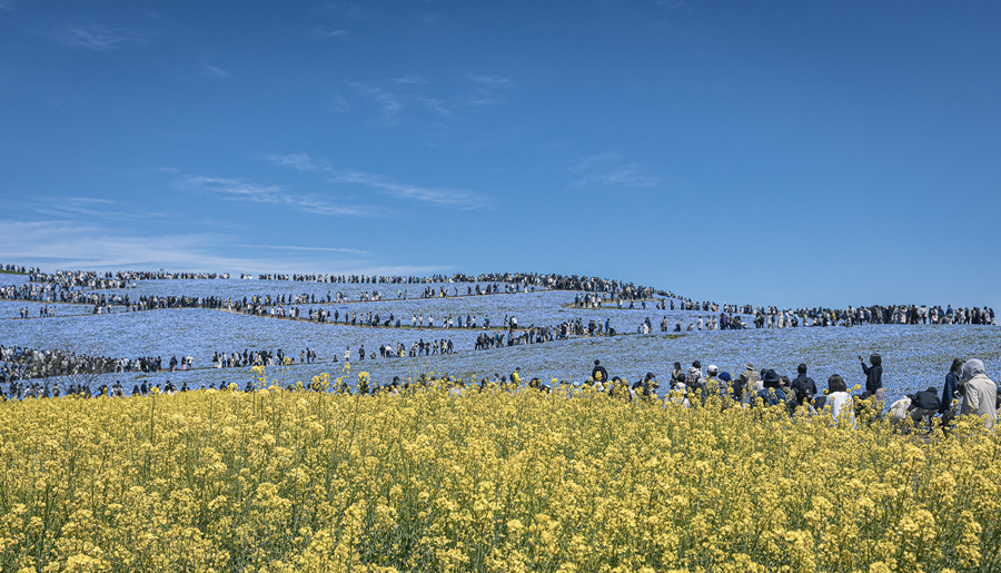 同样在4-5月,日本栃木县足利花卉公园紫藤正当时,藤枝如瀑布般美的令人窒息。除了紫藤,还有少许白藤,一阵风吹过,藤枝在风中摇曳,楚楚动人。茨城县日立海滨公园也不甘示弱,漫山遍野开满蓝色的粉蝶花,如梦似幻。