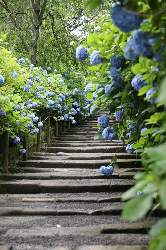 到了梅雨季节,便是紫阳花的天地了。每年一进入六月,约2500株紫阳花一齐绽放,镰仓明月院甚至被人们亲切地称为“紫阳花寺”。