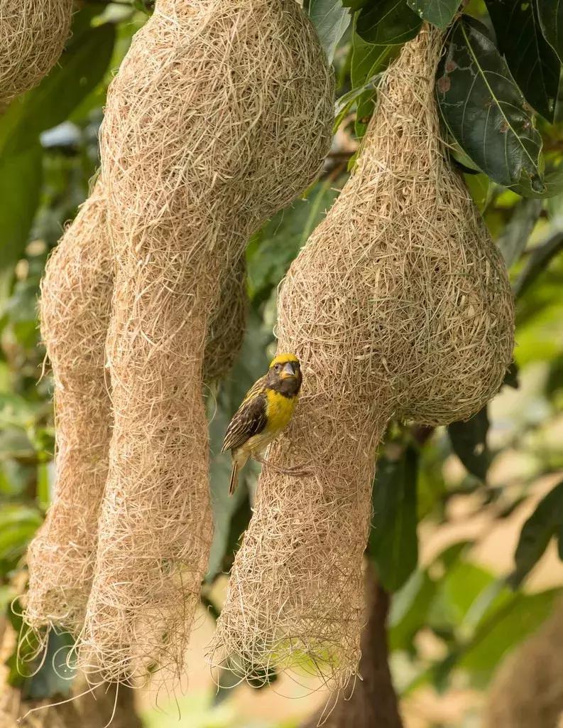▲一只刚刚建巢的雄性黄胸织布鸟,它脚下是复杂的编织网,用于将巢体紧紧固定在树枝上