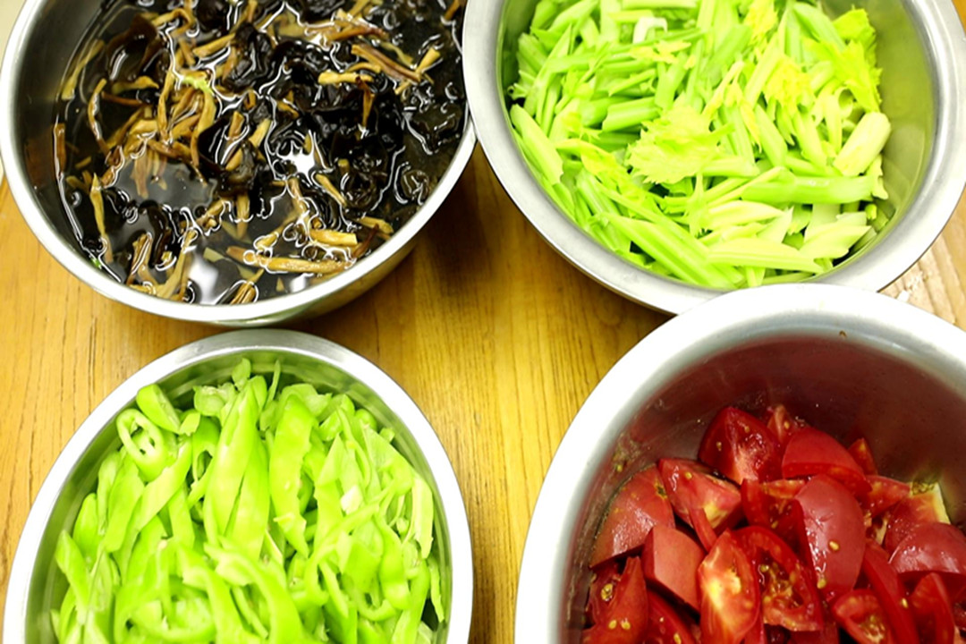 1.今天的食材全都是半成品,做起来更加方便应手,把羊心、羊肝、羊肚、羊肺、羊脸该切丝切丝,该切片切片;蒜黄切段、香菜也切段;白菜心把叶片打散、切成段;另外切点姜蒜末和野山椒段备用。