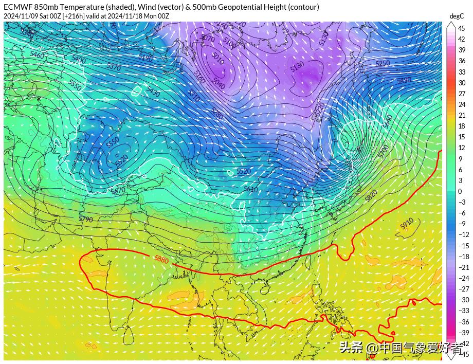 尽管目前台风和副热带高压活动频繁,势力较为活跃,但超级计算机的预测结果显示,到11月下旬开始,天气形势似乎有逆转的迹象。高纬度地区的西风带波动开始活跃,似乎酝酿着新的天气变化。从图中可见,长期堆积的西伯利亚冷空气已经蓄势待发,可能会形成大规模的冷空气团,逐步南下。