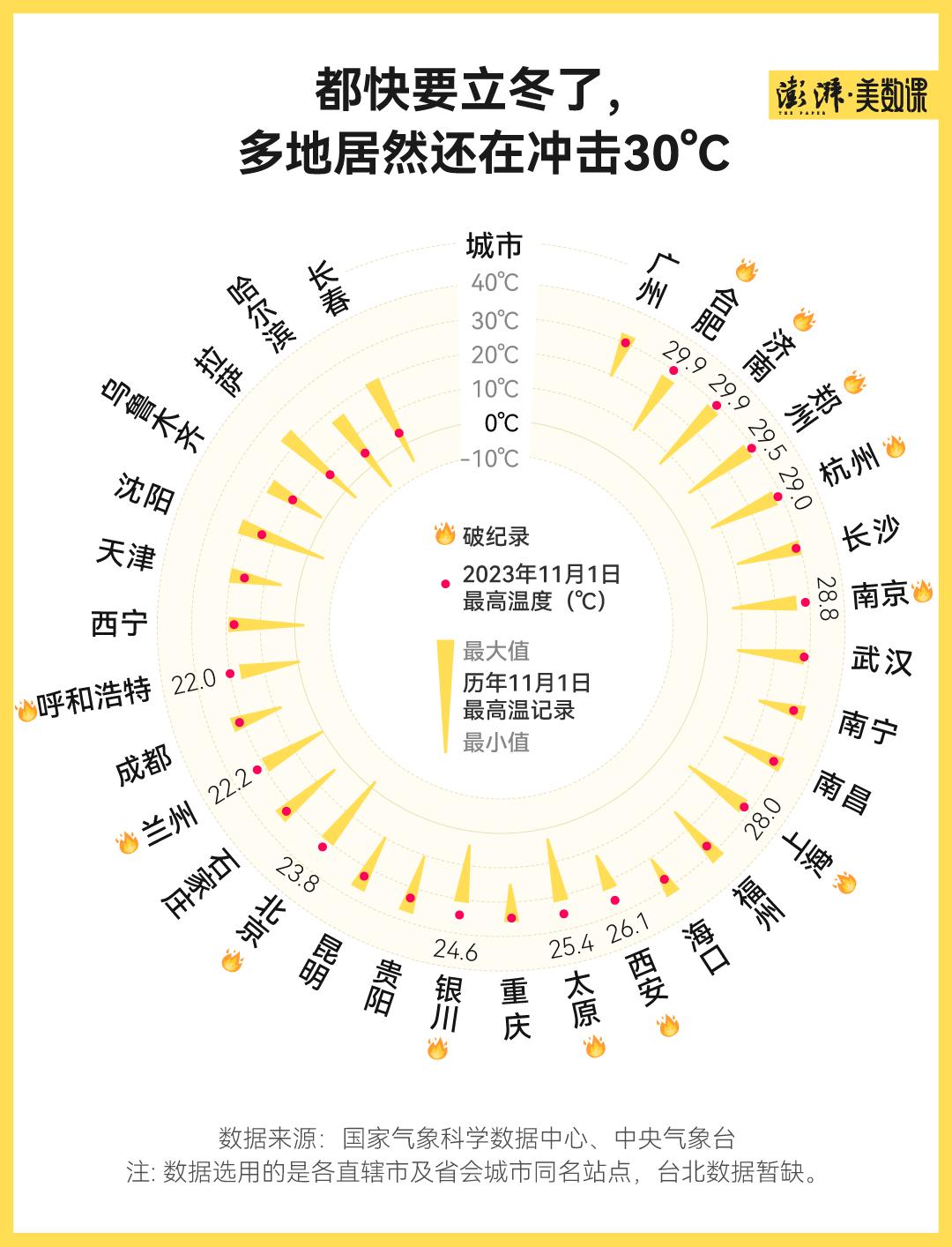 除了穿衣的感受,气象数据也客观证明了最近气温的反常。11 月 1 日,多个城市就经历了当日有记录以来最热的一天。