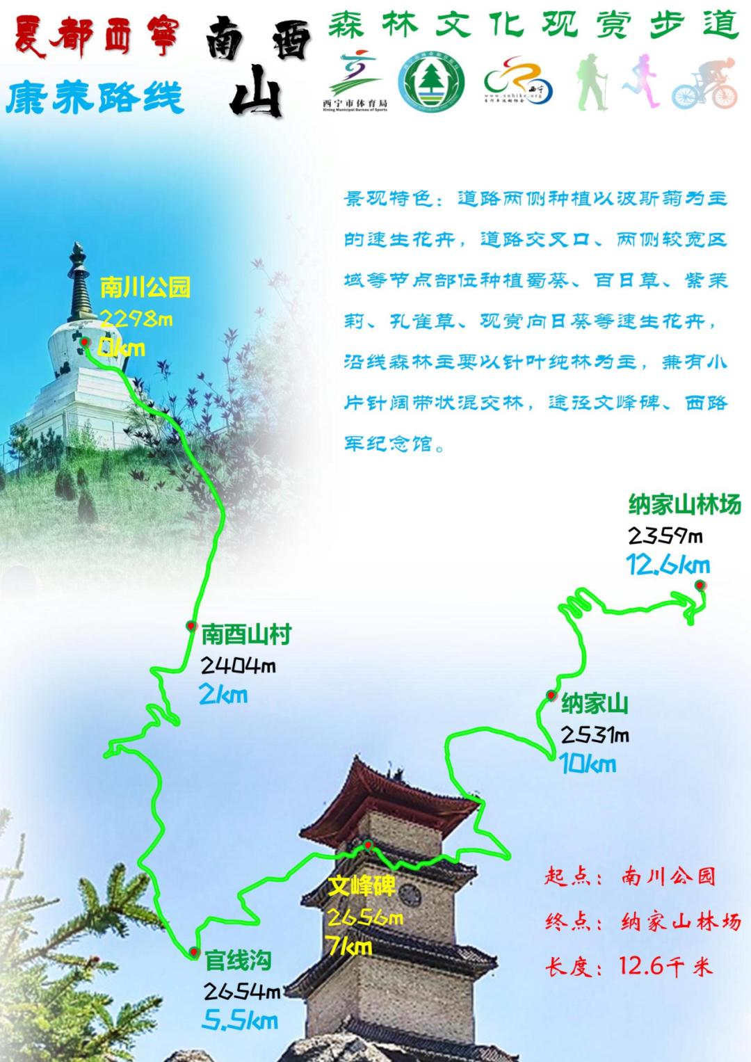 该路线全长12.88公里,从南酉山村出发沿途经过文峰碑、联合村至纳家山林场。道路两侧种植以波斯菊为主的速生花卉,道路交叉口、两侧较宽区域等节点部位种植蜀葵、百日草、紫茉莉、孔雀草、观赏向日葵等速生花卉。路面为水泥硬化路,沿途分布有西宁市烈士陵园、文峰碑等人文景观。其中,中国工农军西路军纪念馆是首批确立的100余个红色旅游经典景区之一;文峰碑始建于明孝宗弘治三年(1490年),距今500余年,后于2007年重建碑主体共五层,总高31米。沿线森林主要以针叶纯林为主,兼有小片针阔带状混交林。每年在此线路都会举办山地自行车赛,受到来自全国各地骑手的积极响应。该线路人文、山地、生态景观多样,生物多样性丰富,经过多年的建设现已逐步形成以森林为背景,人与森林、人与自然和谐相处的文化样态,生态性、民族性、地域性和人文性的森林文化特征初步显现。
