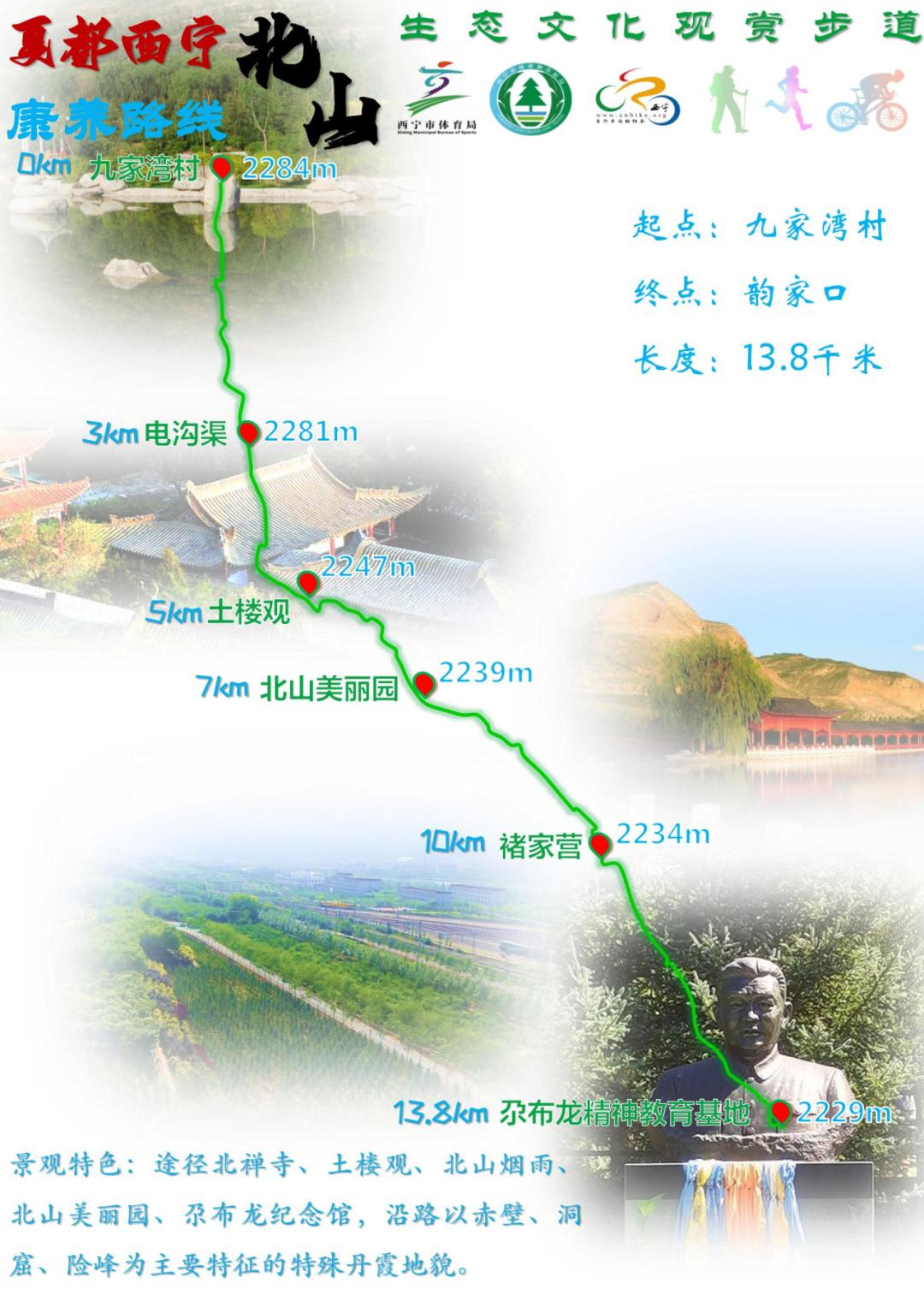 该路线从九家湾村出发沿着电沟而下,经过北禅寺、北山美丽园景区至韵家口结束。道路两侧栽植以月季为主的景观花卉,路面为沥青柏油路,北禅寺、中国第二大“悬空寺”土楼观景区、“西宁古八景”之一的北山烟雨景区、北山美丽园景区、各省级部门绿化区、尕布龙纪念馆等分布其中。山、水、林带、花海、假山、仿古建筑、道路交相呼应、相互映衬,与远处北山大背景有机融为一体,犹如一幅美丽的山水园林风景画卷,层层铺展,美不胜收。整条线路人文、自然、生态景观极其丰富,是市民体验生态康养的特色线路,该区域也是领略人与自然和谐相处、和谐发展的典型片区。