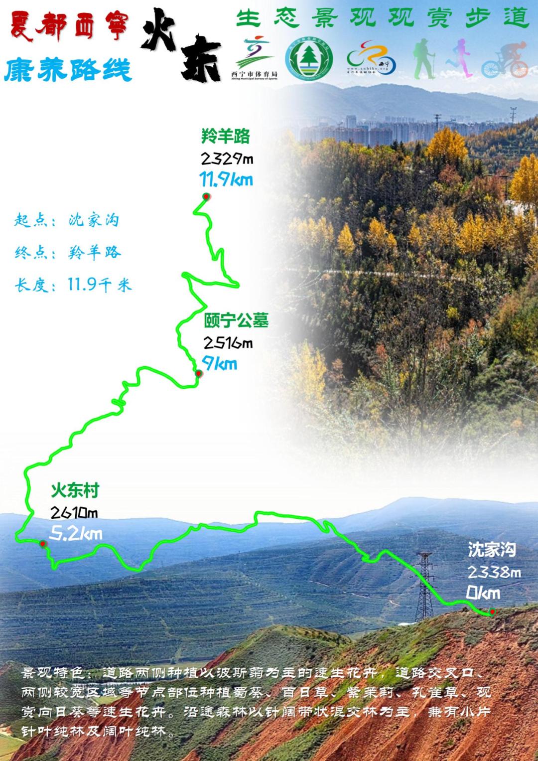 该路线从沈家沟口进入沿火东后山盘山路曲折前行,经过毛鸡湾、韩家垭豁、二道湾、野狐坪、市电信公司绿化区、市法院绿化区至羚羊路结束。其中,沈家沟口至韩家垭豁为砂石路段,韩家垭豁至羚羊路为水泥硬化路。道路两侧种植以波斯菊为主的速生花卉,道路交叉口、两侧较宽区域等节点部位种植蜀葵、百日草、紫茉莉、孔雀草、观赏向日葵等速生花卉。沿途森林以针阔带状混交林为主,兼有小片针叶纯林及阔叶纯林,通过对沿途森林的观察,可以看到西宁市四十年来生态建设演替变化的过程。该线路所处片区是生态建设中保护和利用的样板示范区。