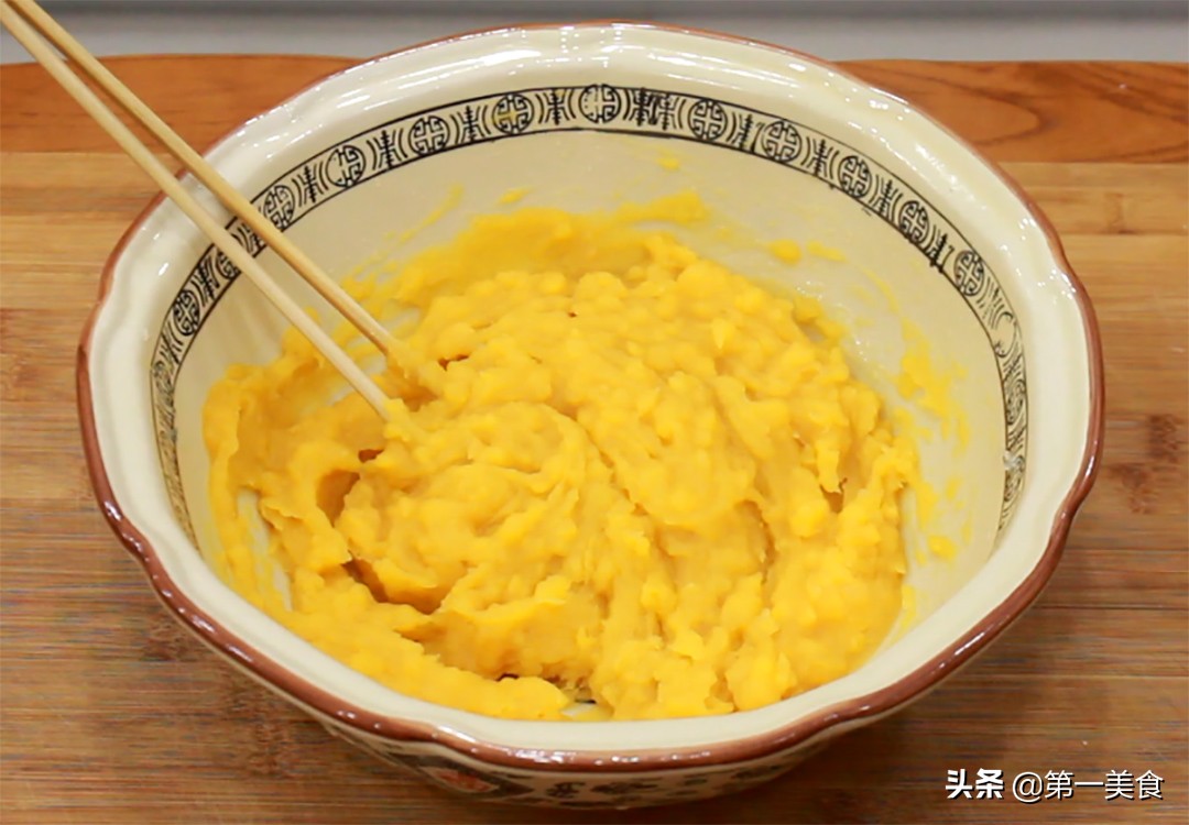 2.蒸熟以后把南瓜和紫薯分别盛放在盆中,先用勺子把南瓜压成细腻的南瓜泥,再放入白糖10克,糯米粉50克掺匀,和成糯米南瓜团即可,在上面抹一层植物油,以免我们做的饼的时候沾手。