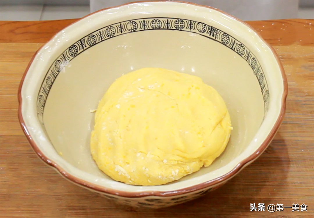 在放凉的红薯泥中加入糯米粉100克,面粉30克,面粉和淀粉主要用来增加红薯泥的饱和力,搅拌均匀再揉成松软的面团备用。