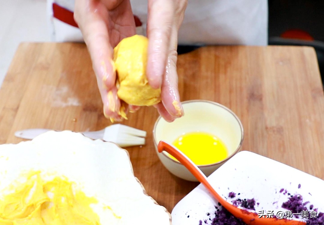 3.在手上抹点植物油,防止南瓜泥沾手,揪一小块南瓜泥整理成薄片,在上面放上紫薯馅,把开口捏在一起,揪下多余的南瓜泥,在手心里压成圆形的小饼。