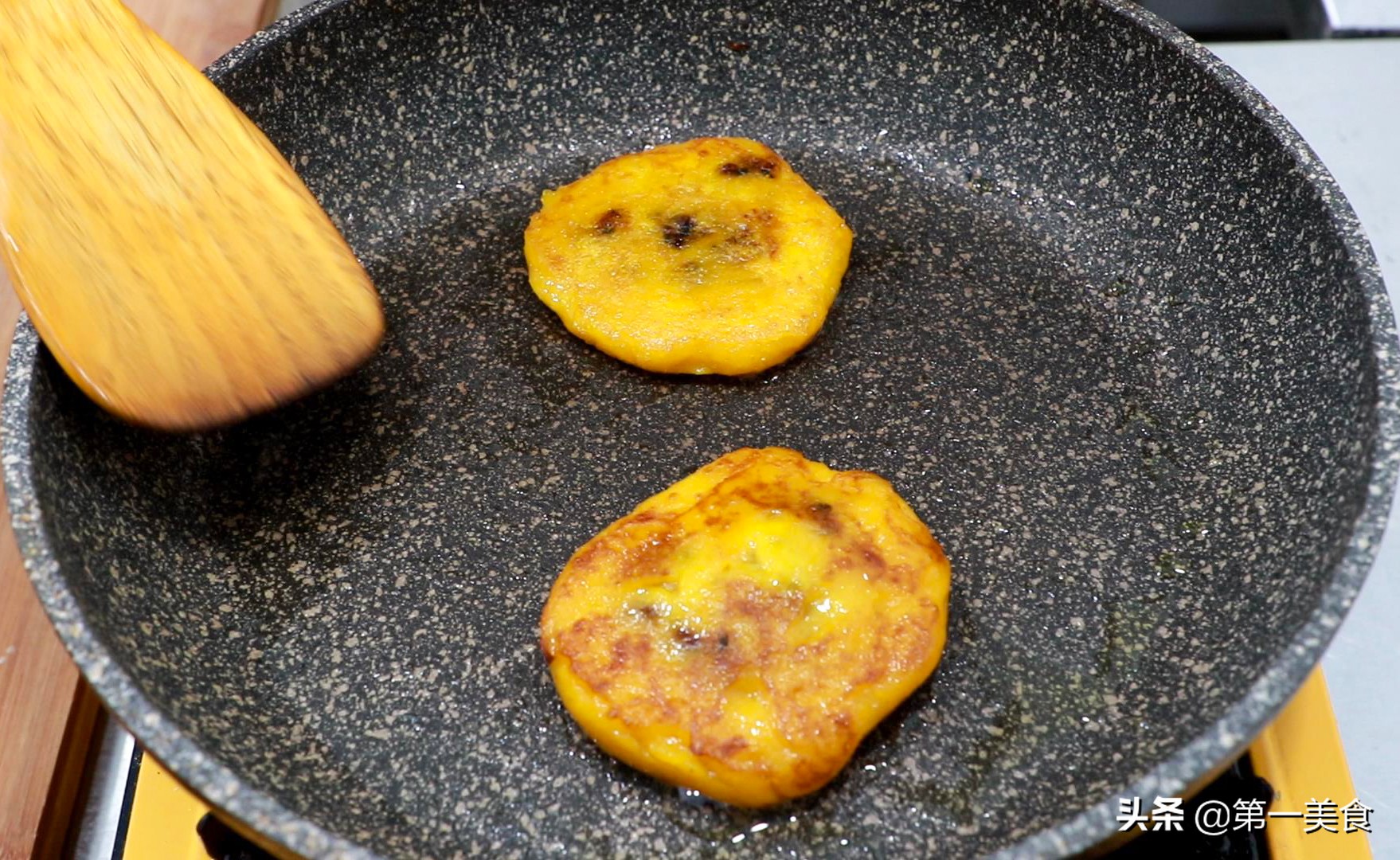 4.锅烧热以后把小饼放进去,再整理的圆润一点,保持小火烙1分钟,饼周围变色,底面微黄时翻面,翻过来再烙2分钟,另一面呈金黄色再次翻面,就这样勤翻面烙4分钟左右,两面都烙成金黄色即可出锅,一道金黄软糯的南瓜紫薯饼就做好了。
