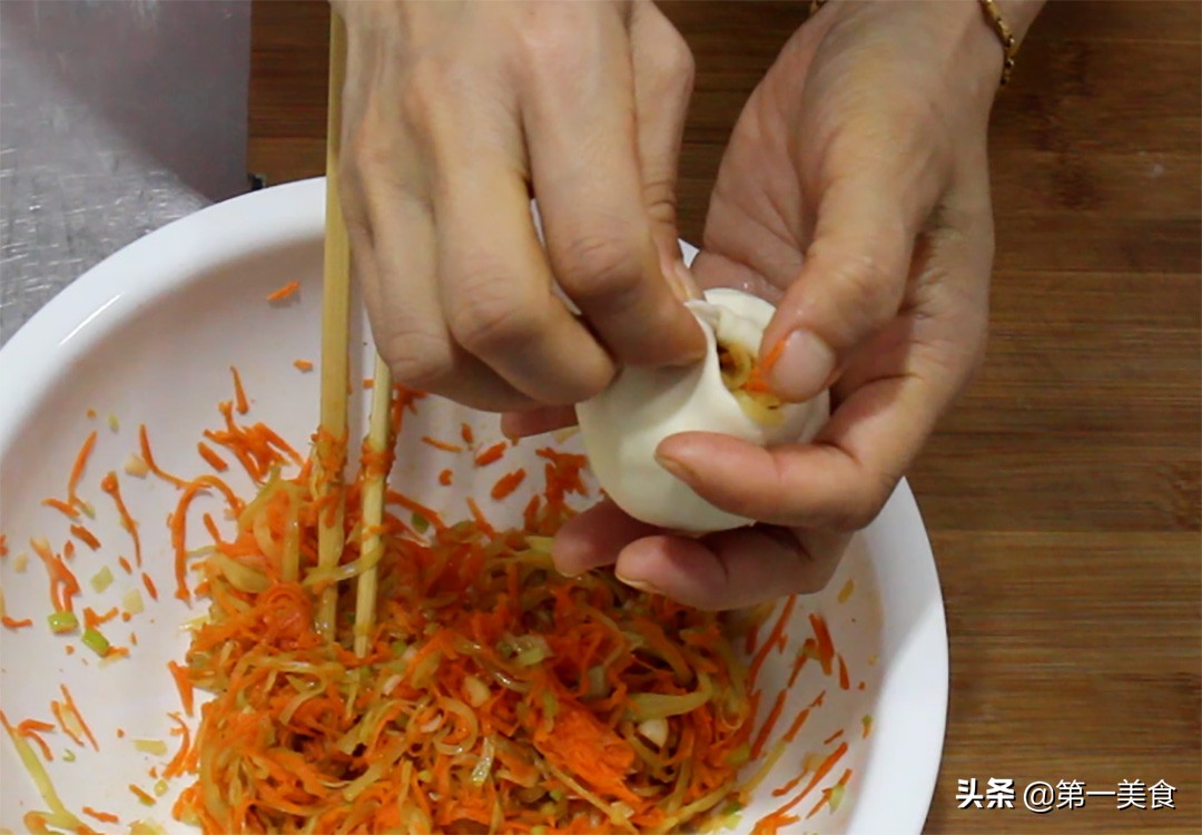 5分钟以后,胡萝卜和莴笋已经变软了,捞出来攥干水分,淋入一点植物油,加入五香粉2克,生抽5克,翻拌均匀馅料就调好了。