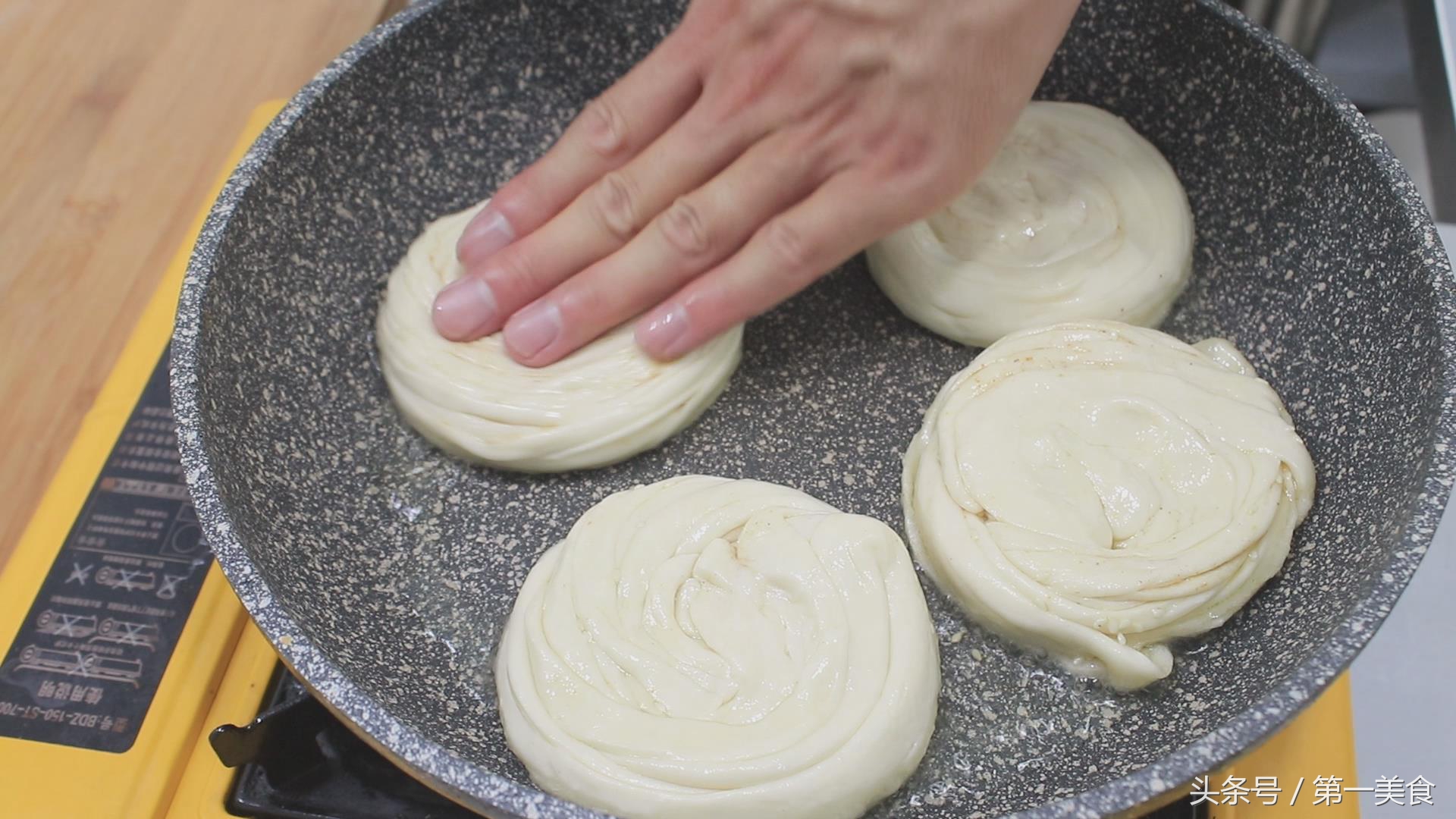 锅热以后刷上一层植物油,把盘丝饼坯放在锅内,用手把盘丝饼再压扁一些,不至于太厚。