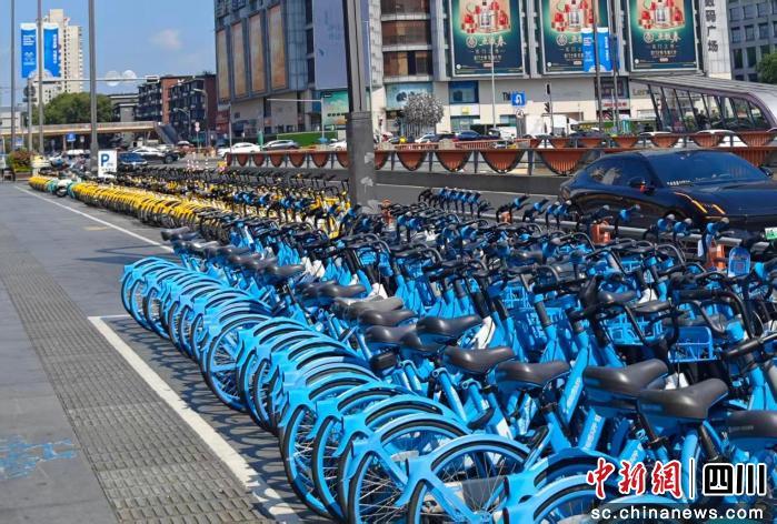 省体育馆外,共享单车分类有序停放。成都市城管委供图