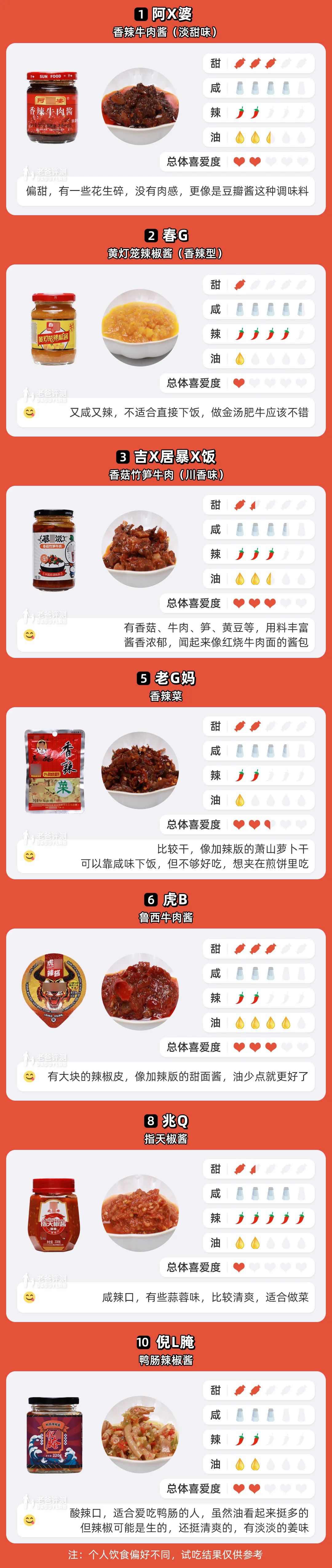 他们盲吃了 15 款下饭神器后,从甜度、咸度、辣度、油润度和综合喜爱程度进行了评分,还描述了具体口感味道。