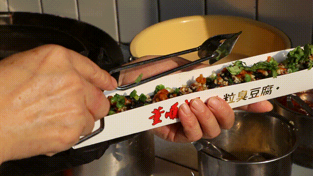 臭豆腐原胚经过三五分钟的油炸后,外皮变得酥脆,用筷子戳开一个小洞,灌入香辣酱料与汤料,搭配辣椒酱和萝卜干,一口咬下去,酥脆软嫩,先鲜后辣,汁水四溢,回味无穷。
