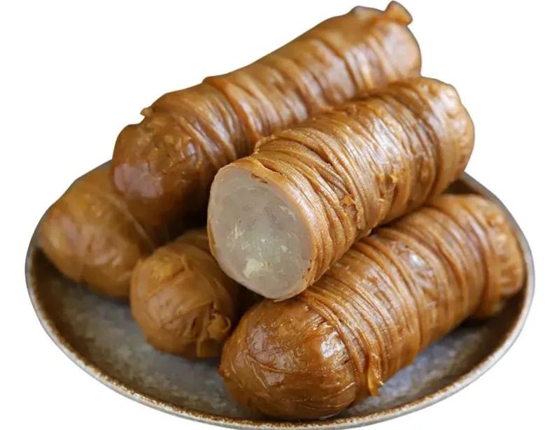 捆鸡是长沙街头的一种常见小吃,有素捆鸡和肉捆鸡两种。听到捆鸡这个名字你们肯定以为那是被五花大绑捆起来的鸡,其实并不是的,捆鸡不是用鸡肉做的。而是由洗净的鸭肠、鸡肠、猪小肠等紧紧捆绑成火腿状,然后在特质卤水中卤制而成的半成品,这就是肉捆鸡。