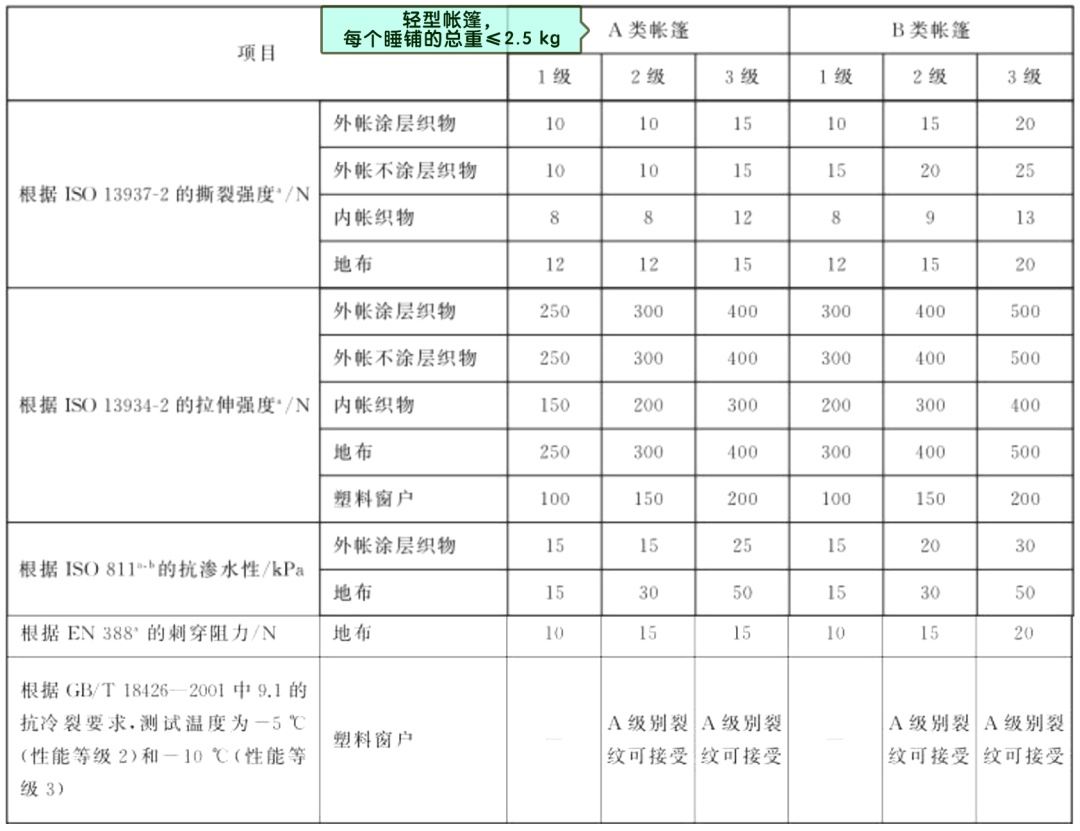GB/Z 27735-2022不同等级帐篷织物要求(部分)